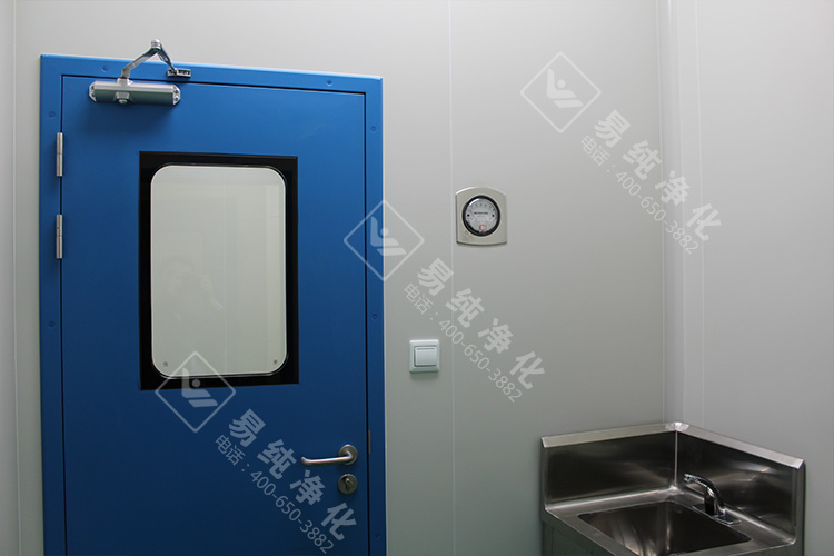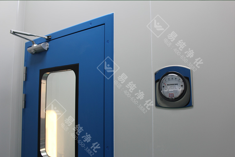 鋼制成品門,雙層中空窗內(nèi)附不銹鋼圓弧處理,右為壓差表