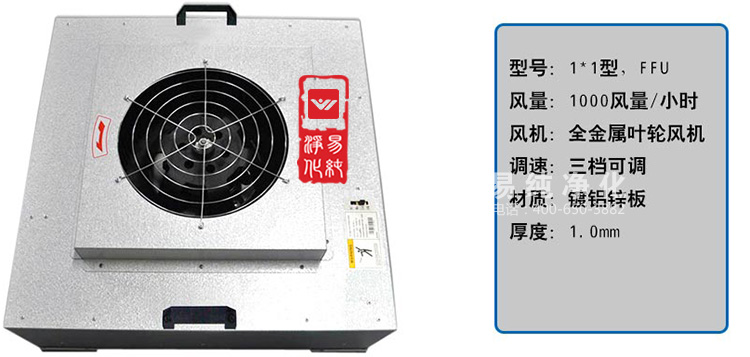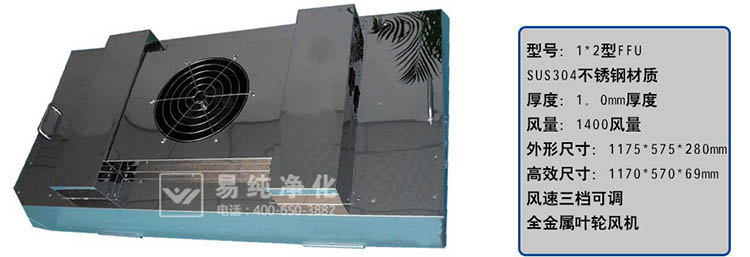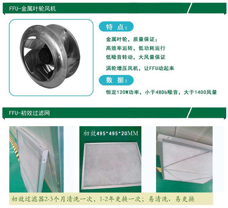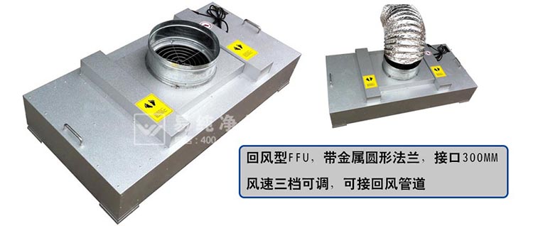 凈化過濾:FFU設有初、兩級過濾網,0.3微米灰塵過濾效率達到99.995%(鈉焰法)。